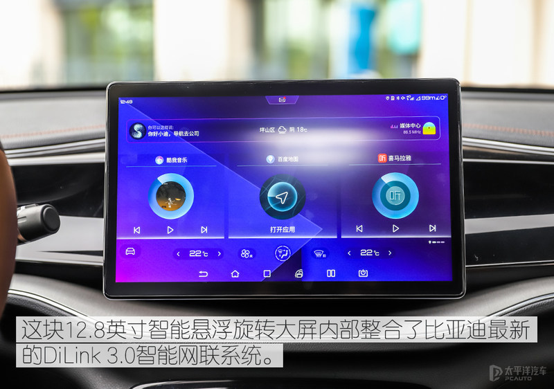 进入到秦PLUS的车内,其中控台横向宽抱式设计,祖传的智能悬浮旋转大屏并没有落下,而且中控台采用了极其简约的设计语言,展示出时尚大气的一面。