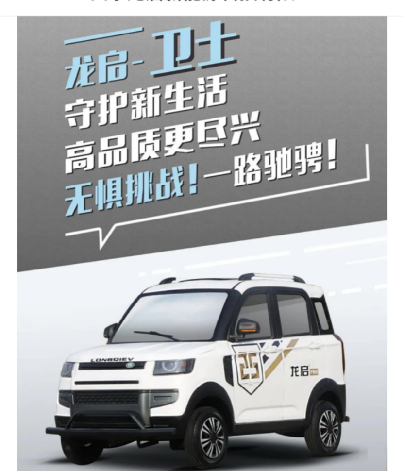 此外,该“厂商”还生产了LOGO名为“LONGQI EV”路虎卫士,并且广告词也很有特色“无惧挑战!一路驰骋!”