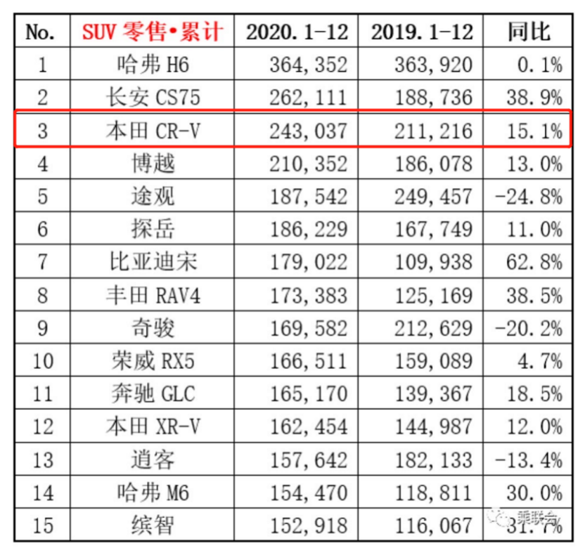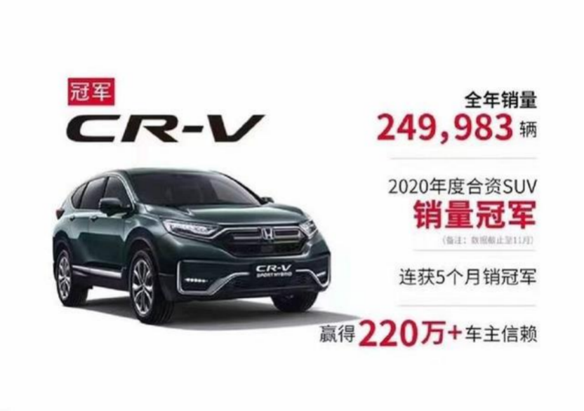 作为国内SUV车型中的一颗“常青树”,本田CR-V全年累计销量超24万辆,仅次于国民神车H6和长安CS75,排在乘联会SUV榜单第三名。其实,去年本田在国内近四分之一的销量来自A级SUV,而其中CR-V的销量占比超过六成。