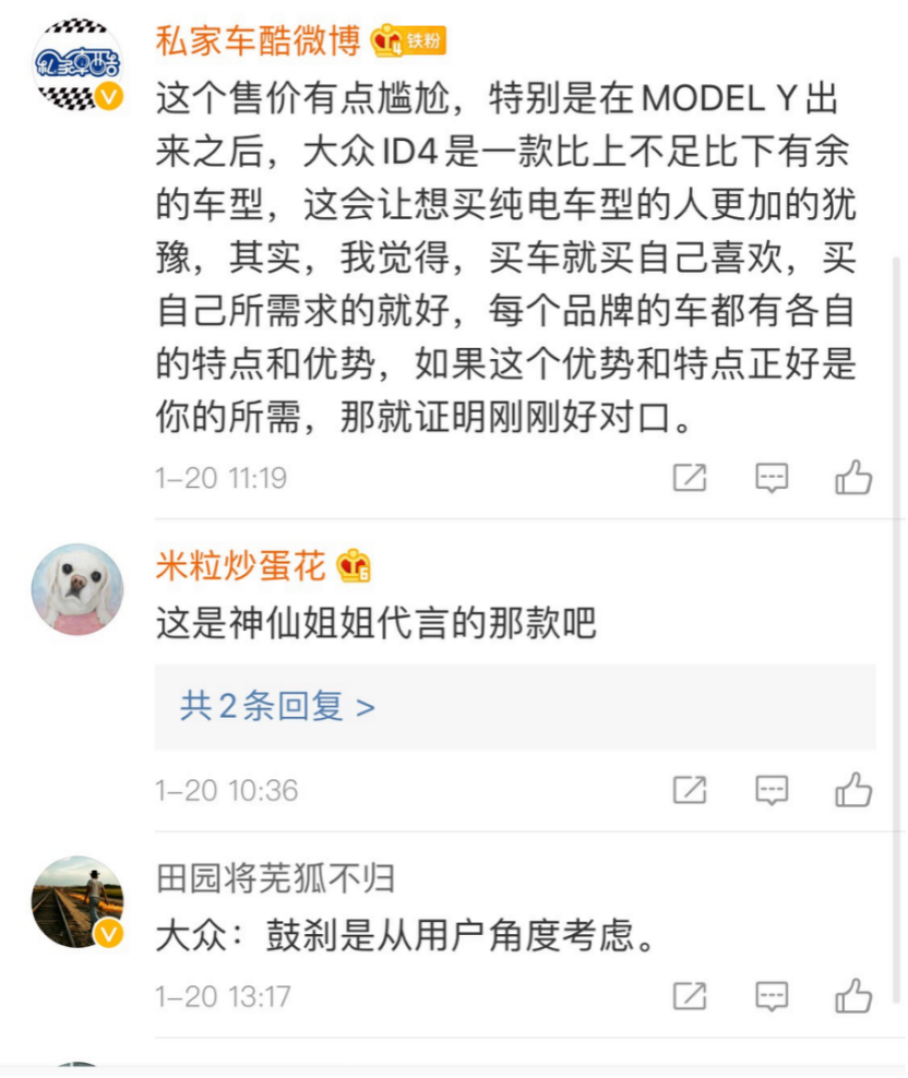 ID.4 CROZZ的出现让我们对大众“另眼相看”,但其实这款车型昨晚价格出现的时候发生了两方不同观点。(见下图)