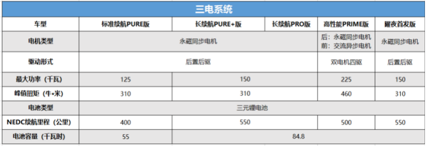 ▲五款车型,分别为标准续航PURE版、长续航PURE+版、长续航PRO版、高性能PRIME版和曜夜首发版,续航里程覆盖400公里-550公里范围。
