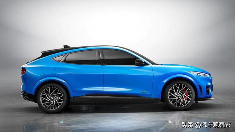 侧面,Mustang Mach-E采用时下较为流行的溜背式的侧面造型,红色的刹车卡钳,辅以赛道味十足的轮毂,让Mustang Mach-E的侧面显得十分战斗,毫无一般SUV上的臃肿之感。