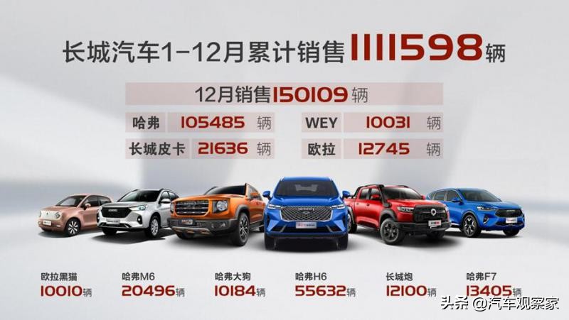 - 哈弗H6、哈弗F7、哈弗M6、哈弗大狗、长城炮、欧拉黑猫6款车型12月销售均破万。