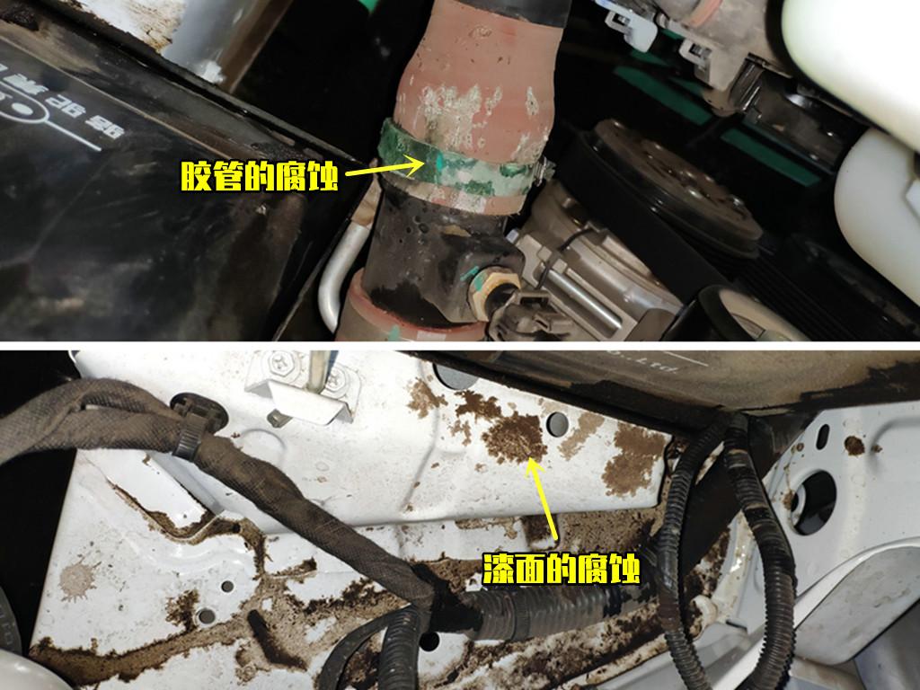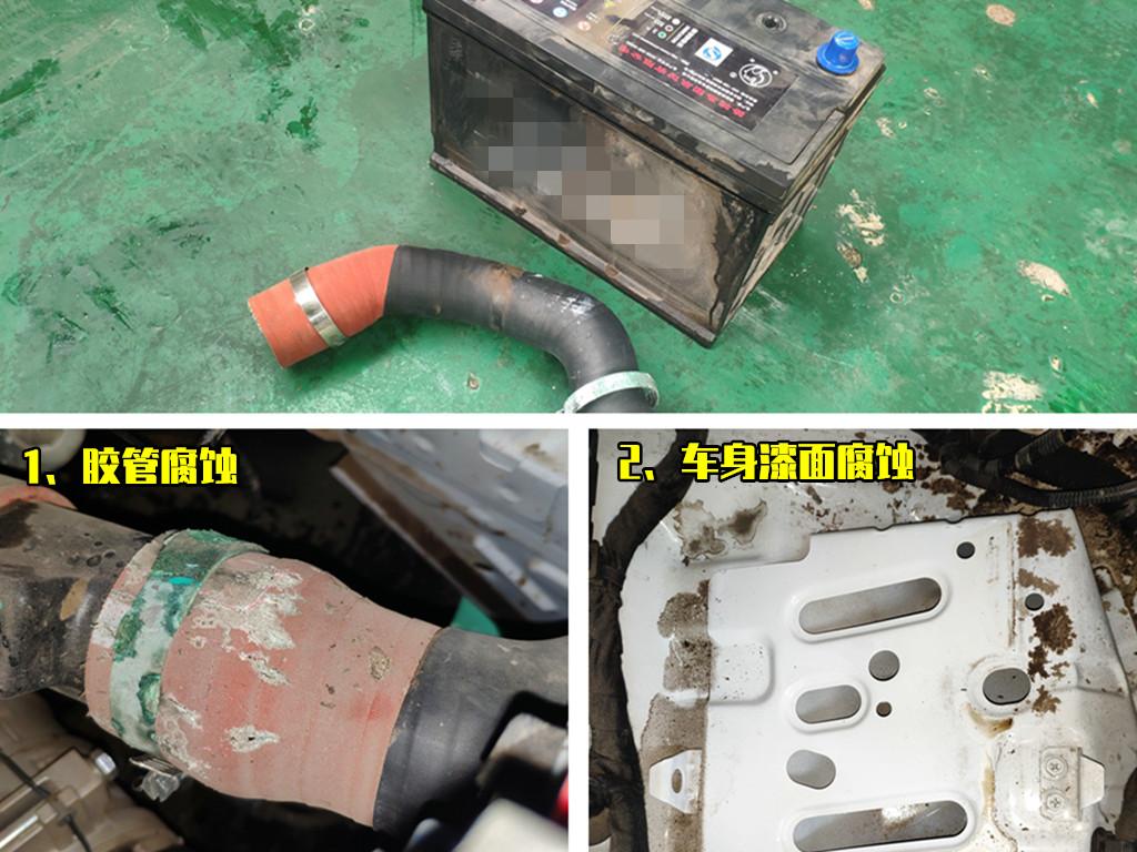 电解液中含有盐酸,盐酸溶解度不高,但足以腐蚀油漆表面、橡胶等物质。从这辆车的案例中可以清楚地看到,电池液溅出的胶管和漆面腐蚀程度不同,破坏性挺大的。
