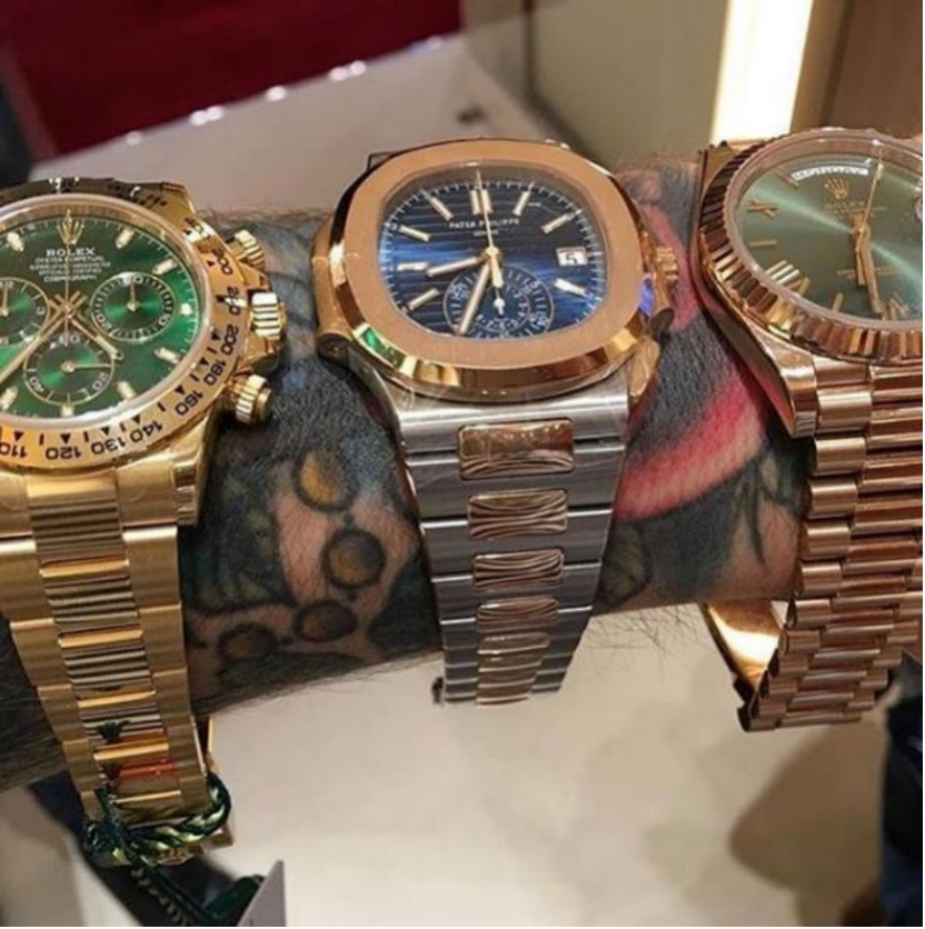上图三块名表,劳力士是嘴炮的最爱,他的收藏柜里劳力士最多。嘴炮写到:这只左胳膊价值100万美元。