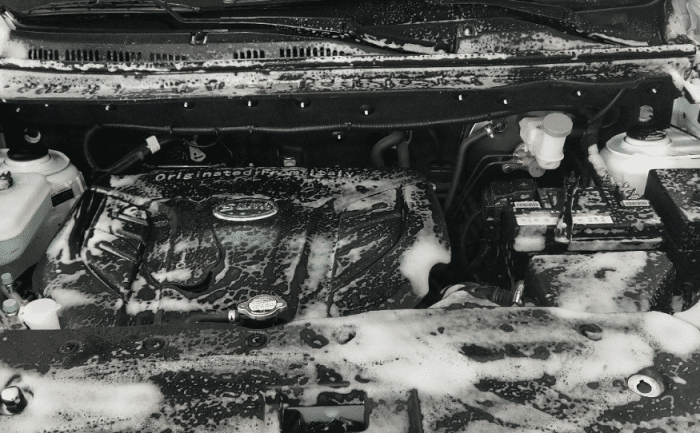 第二步,使用专业清洗剂,发动汽车,在发动机上喷洒泡沫清洗剂,喷洒均匀。当泡沫变成液体时,此时可以用布将发动机擦拭干净。但切记要小心,不要让电线接头接触到水。还要检查接头是否松动。