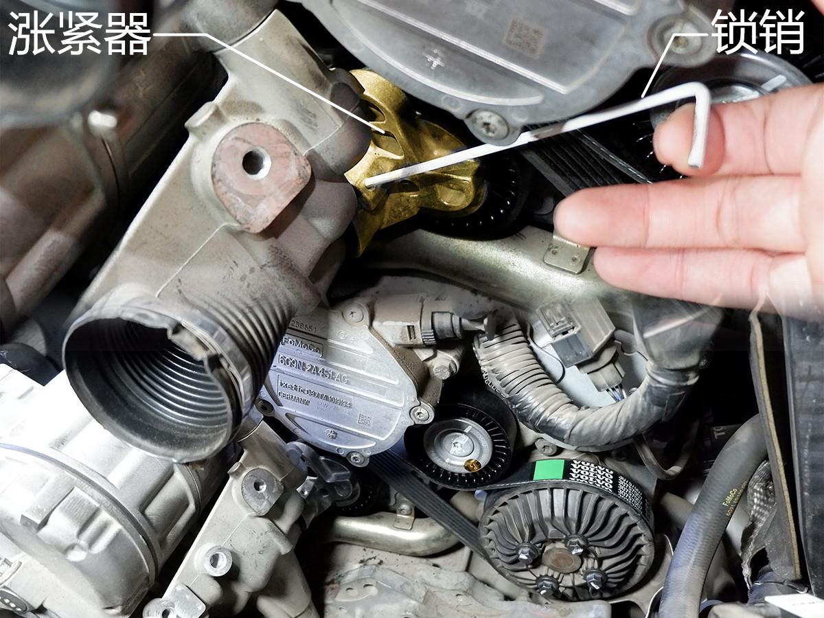 皮带安装到位后,打开涨紧器的锁销,附件皮带会自动张紧。当然,你也要检查所有的皮带和从动轮是否贴紧。即使只有一个从动轮不合适,皮带也会在发动机启动后一分钟内报废。别惊讶,就是这速度~