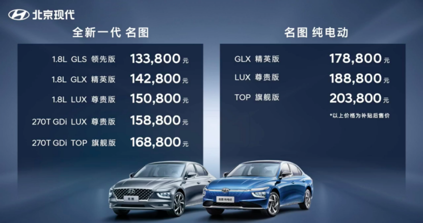 全新一代名图售价13.38万-16.88万元,全系共5款车型。名图纯电动版车型售价17.88万-20.38万元。