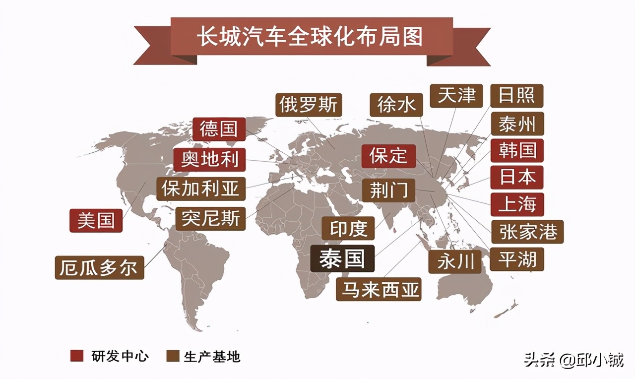 笃行全球化战略,长城汽车目前销售网络已经扩展到全球60多个国家,并形成了全球化的研、产、供、销布局,其中包括“七国十地”全球研发体系,和包括泰国罗勇工厂以及5个海外KD工厂在内的“12+5”全球生产布局。