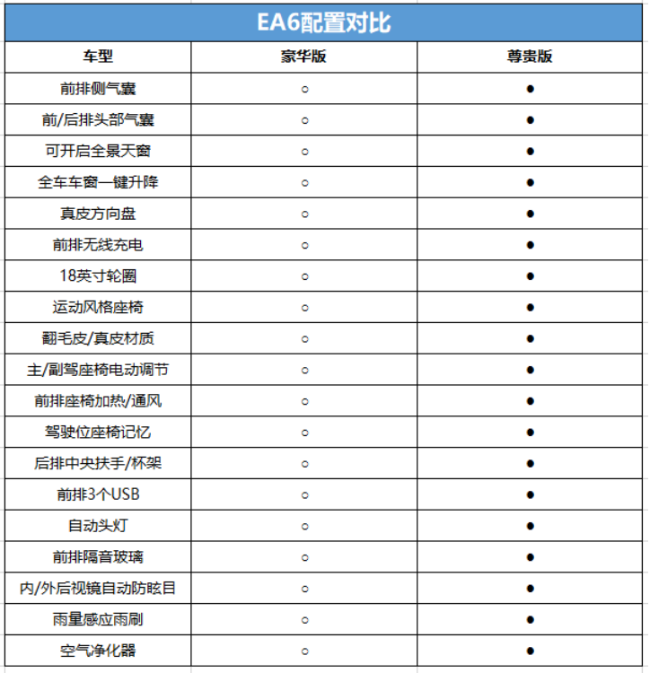 EA6共有2款车型,分别为16.78万的豪华版和18.98万尊贵版,两个配置车型相差2.2万元。而这2.2万元相差在了哪里呢?