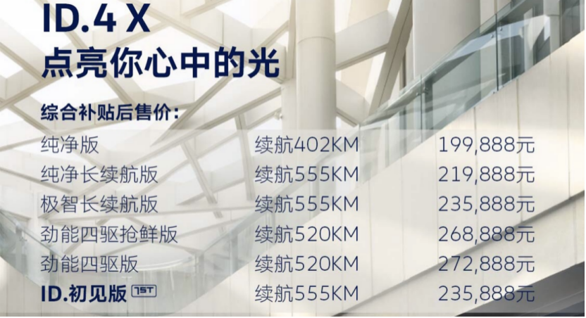 未经允许不得转载:汽车信息网 » ID.4 X正式上市 售价19.9888万-27.2888万