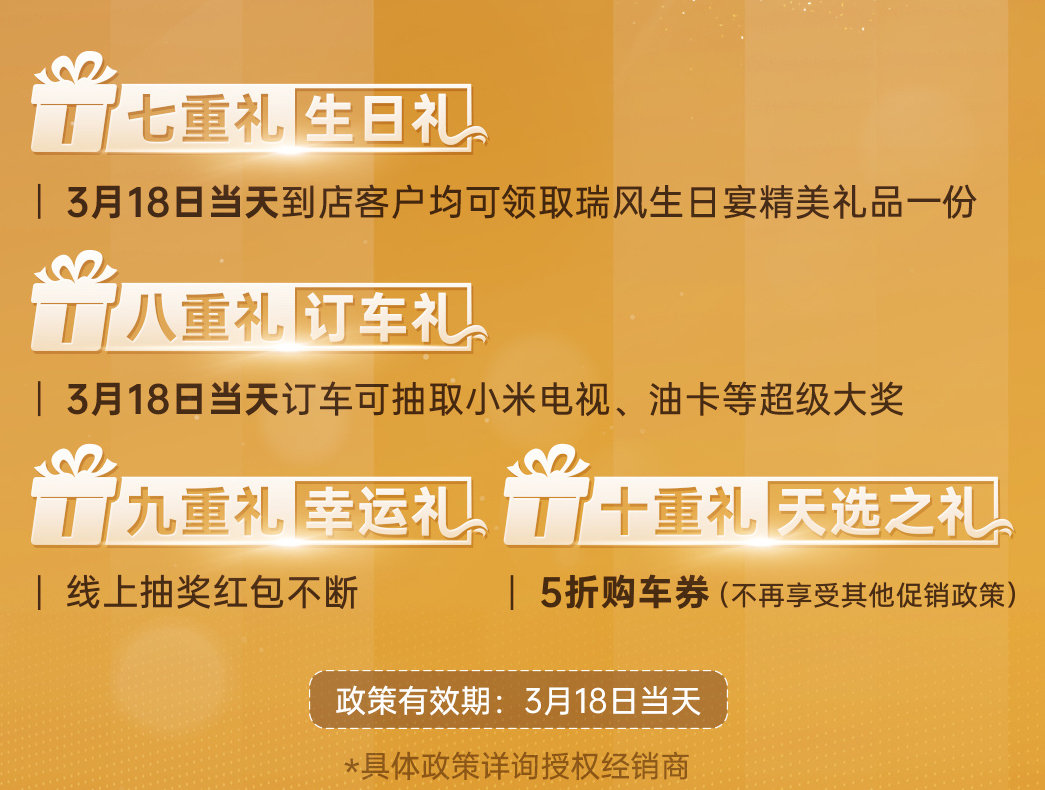 然而,瑞风汽车的诚意不仅仅如此。3月18日当天所有到店客户均可领取瑞风生日宴精美礼品一份;当天订车的用户更能参与抽奖,奖品包括油卡、小米电视等超级大奖!如果没时间到线下参观也没关系,瑞风也将举行20年庆典的线上直播,届时不仅红包抢到手软,更有最高5折购车券的天选之礼等着你!