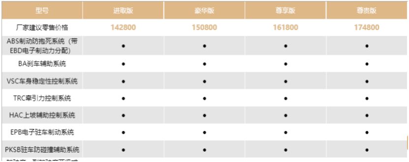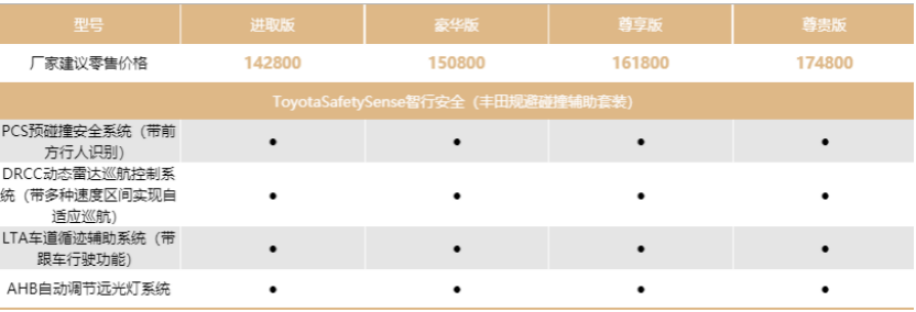 除了像ABS、刹车辅助系统这些基础安全性配置外,Toyota Safety Sense智行安全系统也是全系标配。其中包含预碰撞安全系统(PCS)、车道偏离警示系统(LDA)、自动调节远光灯系统(AHB)、动态雷达巡航控制系统(DRCC)4项功能。也表达了对于交通事故“零伤亡”的努力。