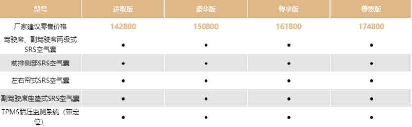 全系配有前排安全气囊、前排侧气囊、前/后排头部气囊、副驾驶座垫式气囊、胎压显示。