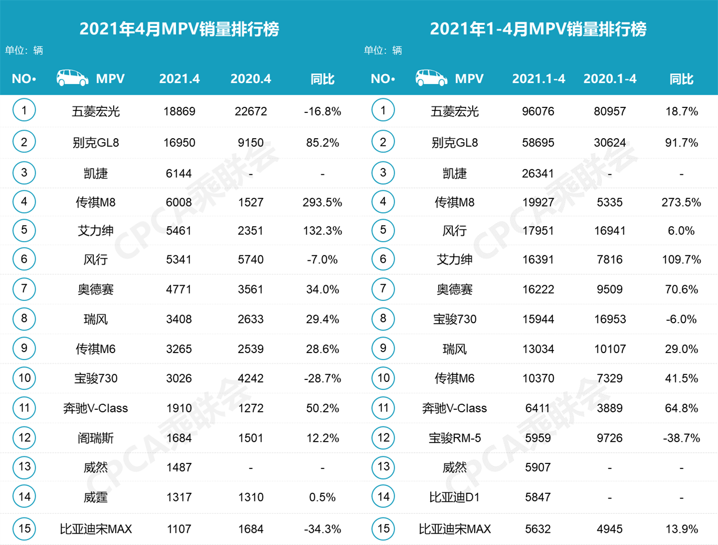 五菱宏光略显颓势,别克GL8也乘胜追击,4月份大卖16000多辆,同比增长达到85.2%,不过累积销量还是远远落后于前者。
