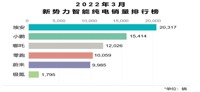 进入4月份,各大厂商开始公布3月销量,根据数据显示,广汽埃安在3月份的单月销量突破2万台(20317辆),在众多造车新势力的纯电车型中排名第一,与之相比,小鹏在3月份的销量为15414辆、哪吒12026辆、零跑10059辆、蔚来9985辆、极氪1795辆。之所以没有提及理想汽车,是因为以上数据均为纯电车型的销量,而理想ONE是增程式电动车。