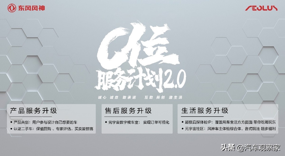 为了增强品牌与用户的联系,“C位服务计划”2.0版本中还包括用户互助、共创社区、用户趣生活等计划,将用户群体进行紧密联结。东风风神的产品不仅仅是一辆座驾,更是能够让用户生活更加精彩的“好朋友”。