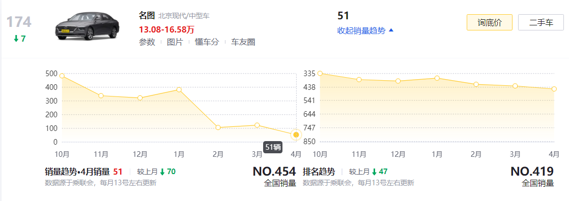 总之,名图4月份51台的销量数据也就证明,国人现在已经基本“抛弃”了这款曾经的韩系中型车“销量担当”,而对于还在考虑它的人来说,我也建议大家趁早放弃购买吧,你们值得拥有更好的车型。