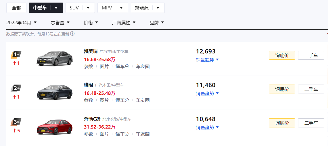 虽然4月份整个车市的销量表现情况都不好,但那些被大众所认可过的主流车型,其实销量表现还是挺不错的。就拿中型车市场来说,凯美瑞、雅阁、奔驰C级均交出了一份月销上万的成绩单,所以即便车市整体下滑,那些该热销的车型也依旧是还会继续热销。