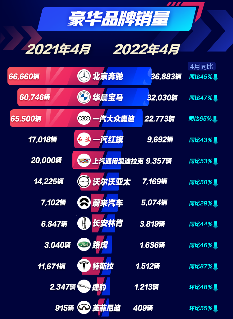 历来不愁卖的奔驰,在4月份也迎来了销量近乎腰斩的情况。具体来看,北京奔驰4月销量36883辆,相比去年同期4月的66660辆,下降了45%。