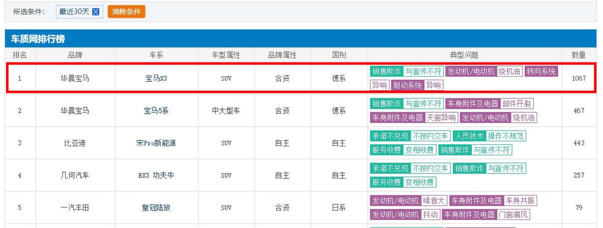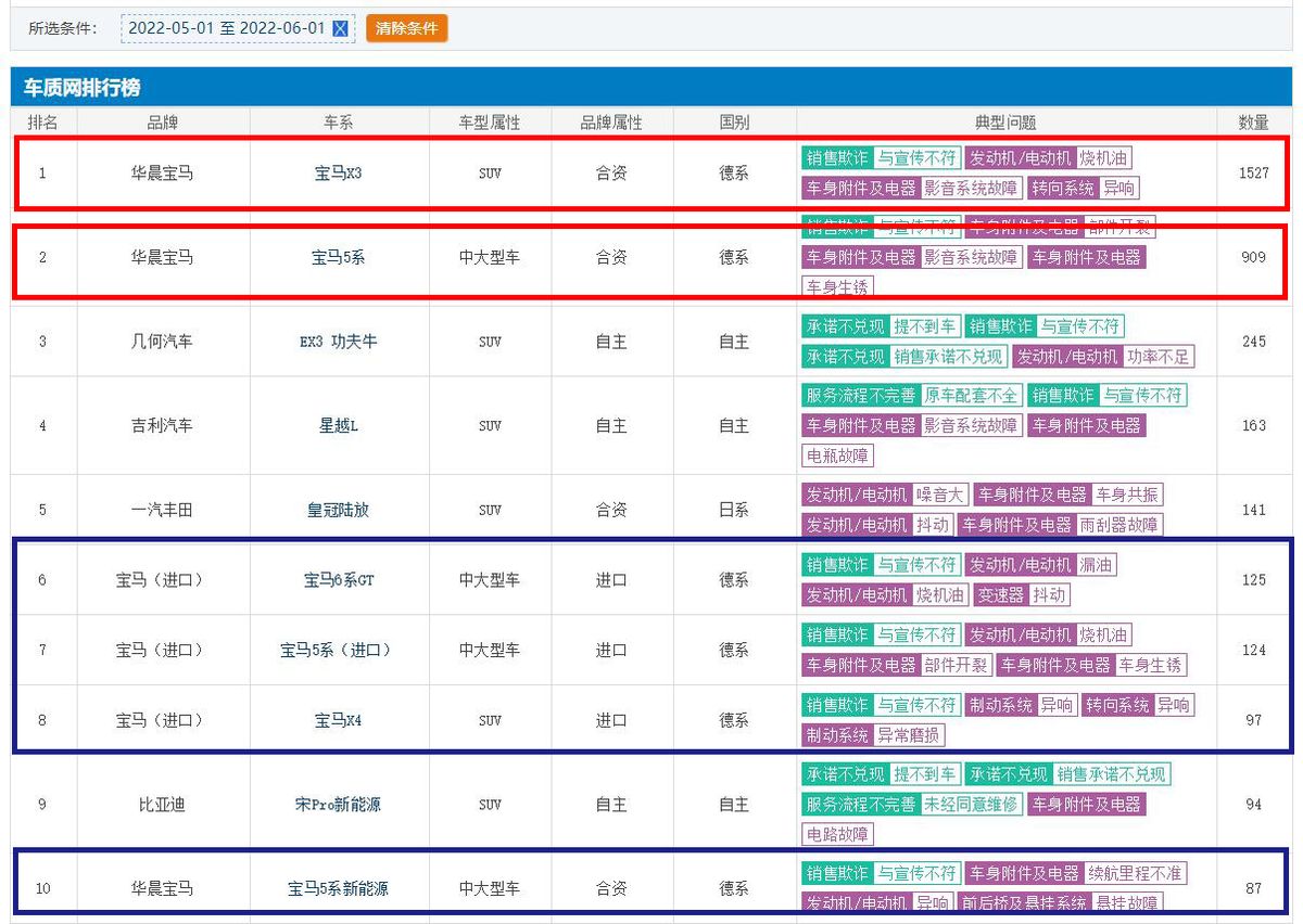 近日,某汽车投诉类网站统计了5月汽车投诉榜单,通过投诉榜排名前十的车型我们会发现,宝马旗下的6款车型居然都赫然出现在5月汽车投诉榜前十名之中,这显然是不符合常理的,而且很明显投诉是炸了。那既然如此,为什么在短短的一个月时间内,宝马就霸屏了5月汽车投诉榜前十呢?下面我们就来了解一下...